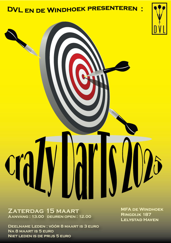 Doe mee met het leukste toernooi van Flevoland, het DVL CrazyDarts toernooi !!! Schrijf je in via Facebook of bestuur@dvlelystad.nl